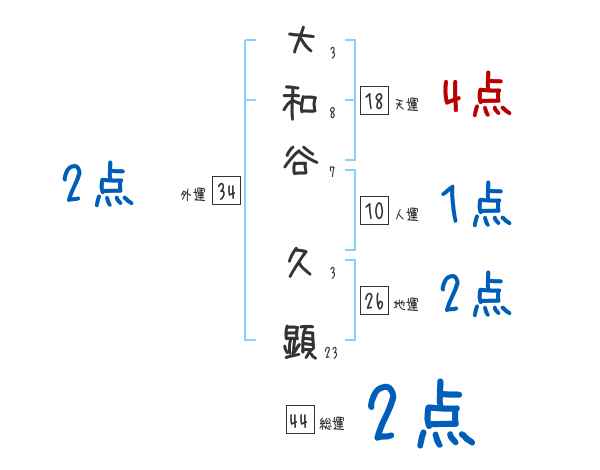 天運![]() | 大和谷久顕さんの天運は18画の4つ星!情熱的で剛気。忍耐力があり信頼される。 家系が持つ宿命的な運勢を表します。祖先から受け継いだ苗字ですので自分の力が及びません。家柄を象徴します。 |