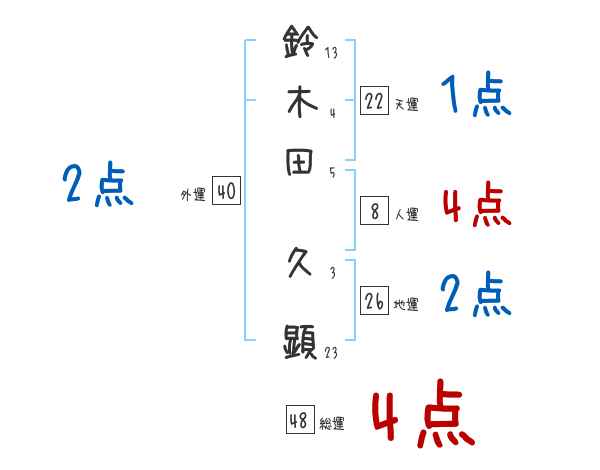 外運![]() | 鈴木田久顕さんの外運は40画の2つ星!自信過剰で物事に固執するためトラブルに注意。 生活面を象徴する運勢です。外部から受ける影響力を表し、結婚運、家庭運や職場、環境への順応性を表します。 |