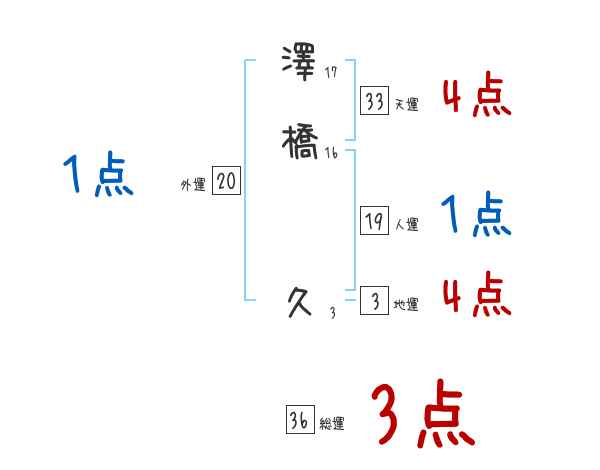 総運![]() | 澤橋久さんの総運は36画の3つ星!先見性が豊かです。多少神経質で苦労することも。 あなたの人生を表す1番重要な運勢です。生涯を通じて影響する総合運となり、主に50歳以降の晩年期に影響を及ぼします。 |