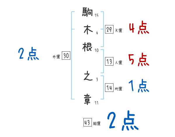 総運![]() | 駒木根之章さんの総運は43画の2つ星!頑固な性格で独立心が強いかも。やや非現実的で浪費に注意しましょう。 あなたの人生を表す1番重要な運勢です。生涯を通じて影響する総合運となり、主に50歳以降の晩年期に影響を及ぼします。 |