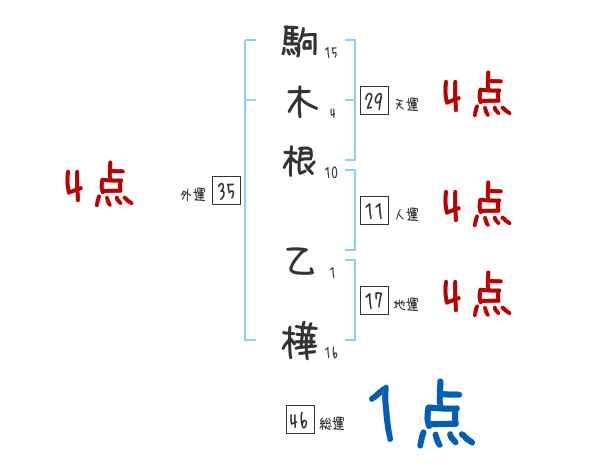 外運![]() | 駒木根乙樺さんの外運は35画の4つ星!温厚な性格で感受性が高い。穏和な性格で人望が厚い。 生活面を象徴する運勢です。外部から受ける影響力を表し、結婚運、家庭運や職場、環境への順応性を表します。 |