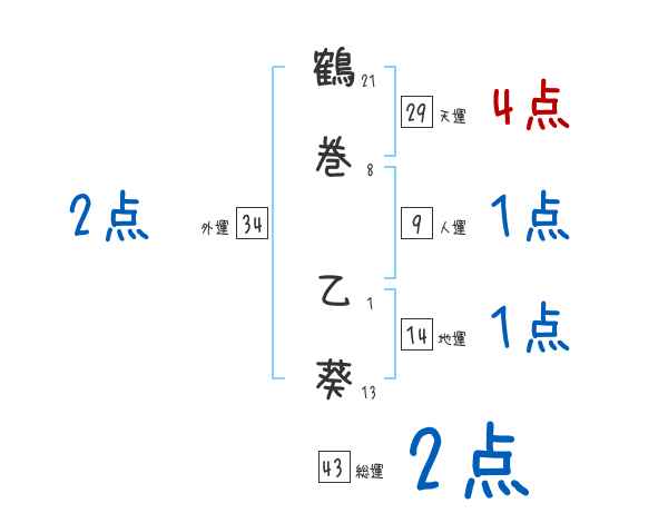 天運![]() | 鶴巻乙葵さんの天運は29画の4つ星!完全主義で才能がある。厳格な心の持ち主。 家系が持つ宿命的な運勢を表します。祖先から受け継いだ苗字ですので自分の力が及びません。家柄を象徴します。 |