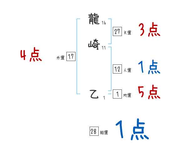 天運![]() | 龍崎乙さんの天運は27画の3つ星!頭脳明晰だが強情で摩擦が多い傾向。孤立に注意。 家系が持つ宿命的な運勢を表します。祖先から受け継いだ苗字ですので自分の力が及びません。家柄を象徴します。 |
