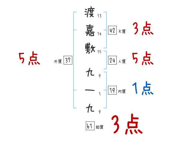 人運![]() | 渡嘉敷九一九さんの人運は24画の5つ星!家庭運が良く順調な人生。金運にも恵まれる。 性格や才能などを表す2番目に重要な運勢です。人間関係や協調性、社会的な成功に影響します。主に20歳から50歳ぐらいまでの中年期の運勢を表します。 |