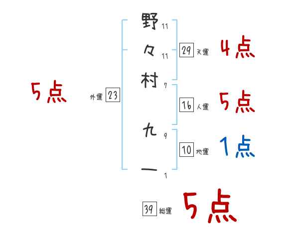 人運![]() | 野々村九一さんの人運は16画の5つ星!人望が厚く大きく発展する。逆転成功が見える。 性格や才能などを表す2番目に重要な運勢です。人間関係や協調性、社会的な成功に影響します。主に20歳から50歳ぐらいまでの中年期の運勢を表します。 |