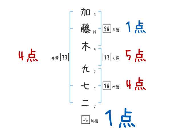 天運![]() | 加藤木九七二さんの天運は28画の1つ星!家庭環境に注意。スポーツで活躍できる能力があるかも。 家系が持つ宿命的な運勢を表します。祖先から受け継いだ苗字ですので自分の力が及びません。家柄を象徴します。 |
