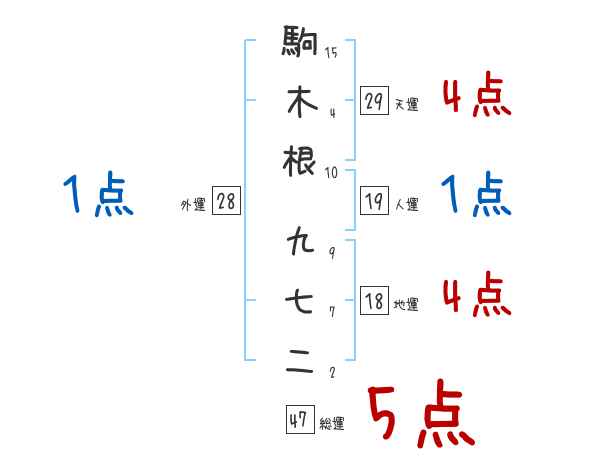 総運![]() | 駒木根九七二さんの総運は47画の5つ星!実力が開花し発展する円満な人生。財に恵まれる。 あなたの人生を表す1番重要な運勢です。生涯を通じて影響する総合運となり、主に50歳以降の晩年期に影響を及ぼします。 |