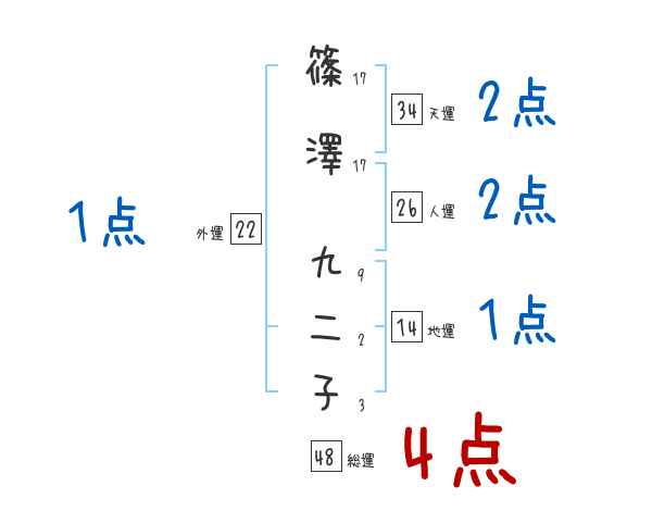 天運![]() | 篠澤九二子さんの天運は34画の2つ星!独創性に優れるが、自尊心が強く災難に注意しましょう。 家系が持つ宿命的な運勢を表します。祖先から受け継いだ苗字ですので自分の力が及びません。家柄を象徴します。 |