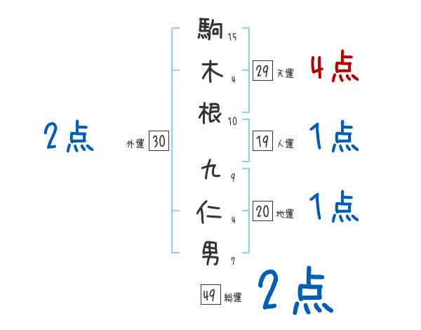 天運![]() | 駒木根九仁男さんの天運は29画の4つ星!完全主義で才能がある。厳格な心の持ち主。 家系が持つ宿命的な運勢を表します。祖先から受け継いだ苗字ですので自分の力が及びません。家柄を象徴します。 |