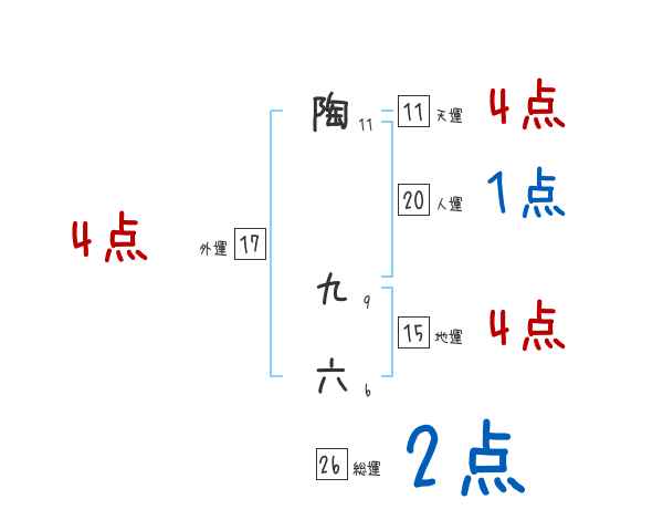 外運![]() | 陶九六さんの外運は17画の4つ星!積極的な行動力。地位を気づき財産を手に入れる。純粋な心と直感力。 生活面を象徴する運勢です。外部から受ける影響力を表し、結婚運、家庭運や職場、環境への順応性を表します。 |