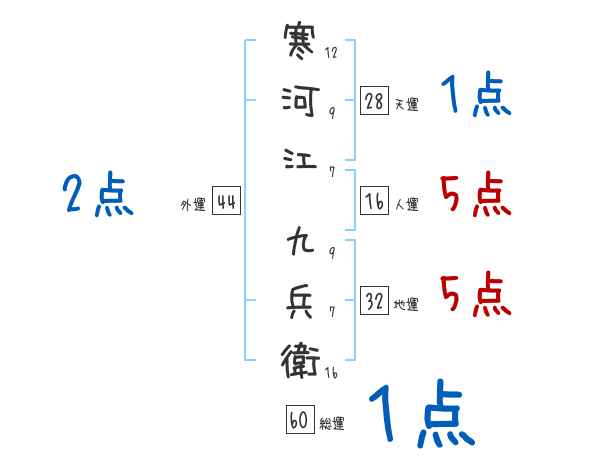 天運![]() | 寒河江九兵衛さんの天運は28画の1つ星!家庭環境に注意。スポーツで活躍できる能力があるかも。 家系が持つ宿命的な運勢を表します。祖先から受け継いだ苗字ですので自分の力が及びません。家柄を象徴します。 |