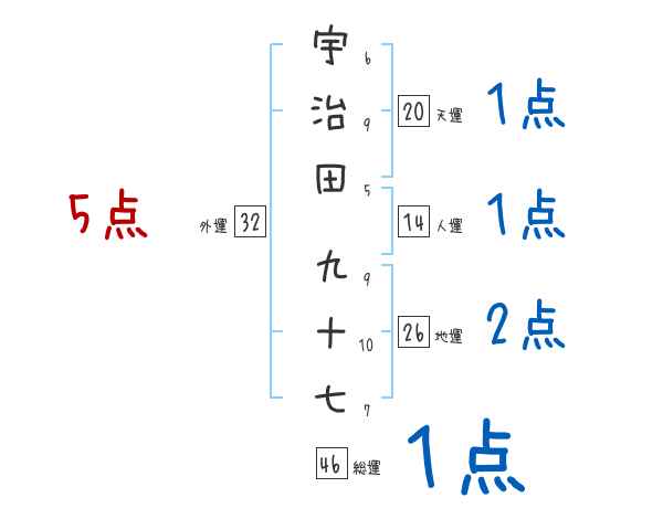 外運![]() | 宇治田九十七さんの外運は32画の5つ星!柔軟性があり成功する。チャンスが多く金運が良い。 生活面を象徴する運勢です。外部から受ける影響力を表し、結婚運、家庭運や職場、環境への順応性を表します。 |