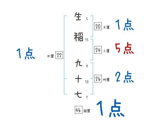 地運![]() | 生稲九十七さんの地運は26画の2つ星!波瀾万丈かも。信頼できる人を大事にしましょう。 個性を表す基礎的な運勢です。性格形成や対人関係、行動力など家庭環境に影響されます。主に誕生してから20歳くらいまでの若年期の運勢を表します。 |