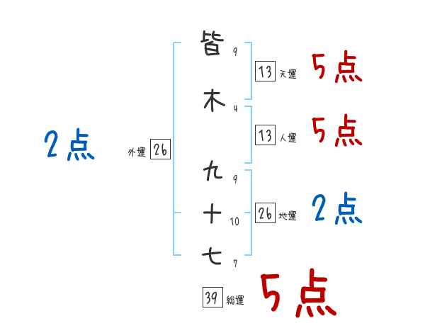 人運![]() | 皆木九十七さんの人運は13画の5つ星!才能に恵まれ人気がある。名声を手に入れる。円満な人生。 性格や才能などを表す2番目に重要な運勢です。人間関係や協調性、社会的な成功に影響します。主に20歳から50歳ぐらいまでの中年期の運勢を表します。 |