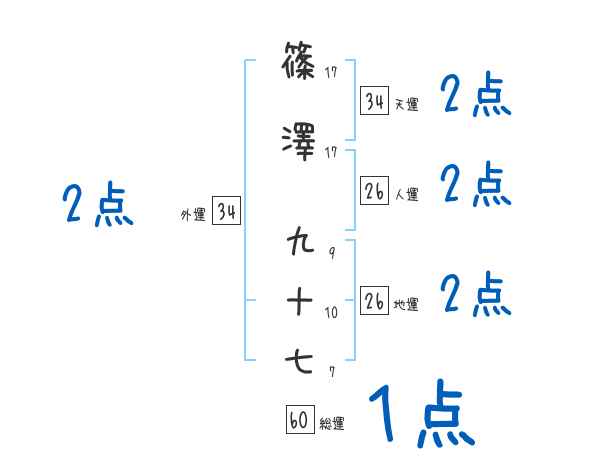 天運![]() | 篠澤九十七さんの天運は34画の2つ星!独創性に優れるが、自尊心が強く災難に注意しましょう。 家系が持つ宿命的な運勢を表します。祖先から受け継いだ苗字ですので自分の力が及びません。家柄を象徴します。 |