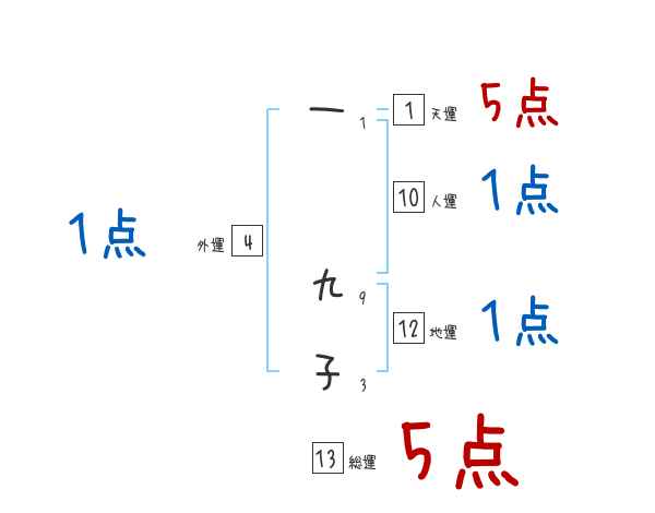 総運![]() | 一九子さんの総運は13画の5つ星!才能に恵まれ人気がある。名声を手に入れる。円満な人生。 あなたの人生を表す1番重要な運勢です。生涯を通じて影響する総合運となり、主に50歳以降の晩年期に影響を及ぼします。 |