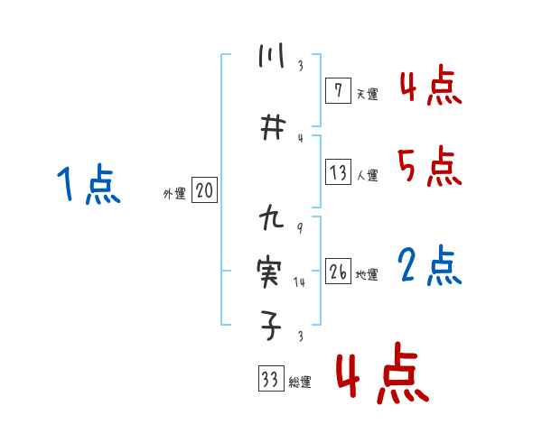 天運![]() | 川井九実子さんの天運は7画の4つ星!強い意志や信念を持ち独立心が強い。自立する。 家系が持つ宿命的な運勢を表します。祖先から受け継いだ苗字ですので自分の力が及びません。家柄を象徴します。 |