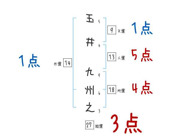 天運![]() | 玉井九州之さんの天運は9画の1つ星!消極的で才能を発揮することが苦手なことも。周りの意見に耳を傾けましょう。 家系が持つ宿命的な運勢を表します。祖先から受け継いだ苗字ですので自分の力が及びません。家柄を象徴します。 |