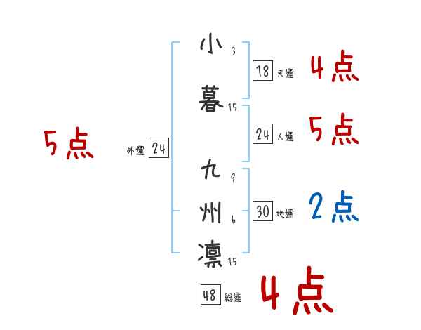 天運![]() | 小暮九州凛さんの天運は18画の4つ星!情熱的で剛気。忍耐力があり信頼される。 家系が持つ宿命的な運勢を表します。祖先から受け継いだ苗字ですので自分の力が及びません。家柄を象徴します。 |