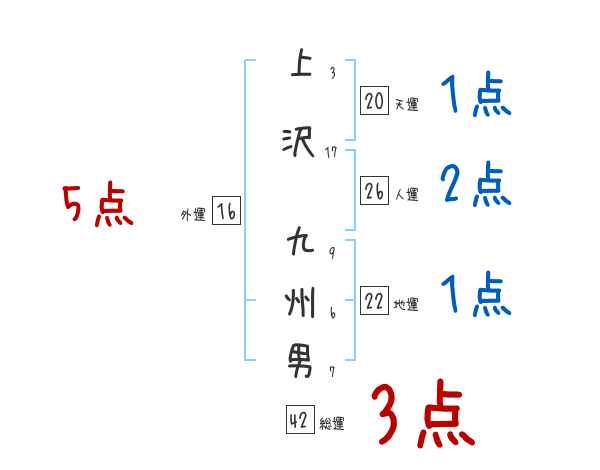 外運![]() | 上沢九州男さんの外運は16画の5つ星!人望が厚く大きく発展する。逆転成功が見える。 生活面を象徴する運勢です。外部から受ける影響力を表し、結婚運、家庭運や職場、環境への順応性を表します。 |