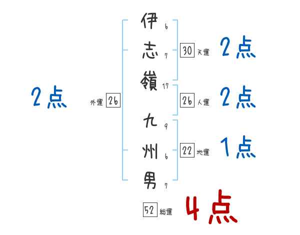 人運![]() | 伊志嶺九州男さんの人運は26画の2つ星!波瀾万丈かも。信頼できる人を大事にしましょう。 性格や才能などを表す2番目に重要な運勢です。人間関係や協調性、社会的な成功に影響します。主に20歳から50歳ぐらいまでの中年期の運勢を表します。 |