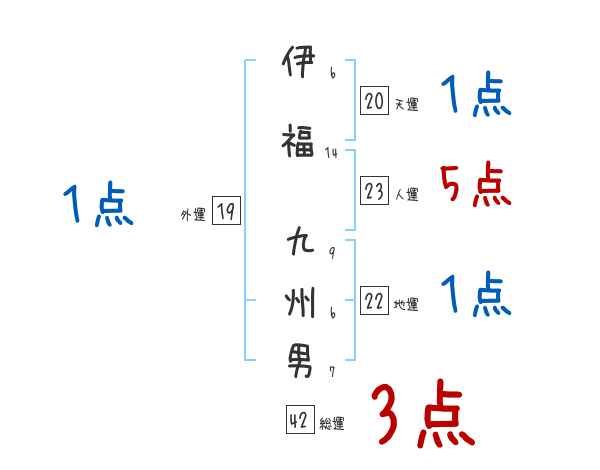 外運![]() | 伊福九州男さんの外運は19画の1つ星!優れた才能を持ちますが、協調性が足りないことも。周りの人と協力する事を意識しましょう。 生活面を象徴する運勢です。外部から受ける影響力を表し、結婚運、家庭運や職場、環境への順応性を表します。 |