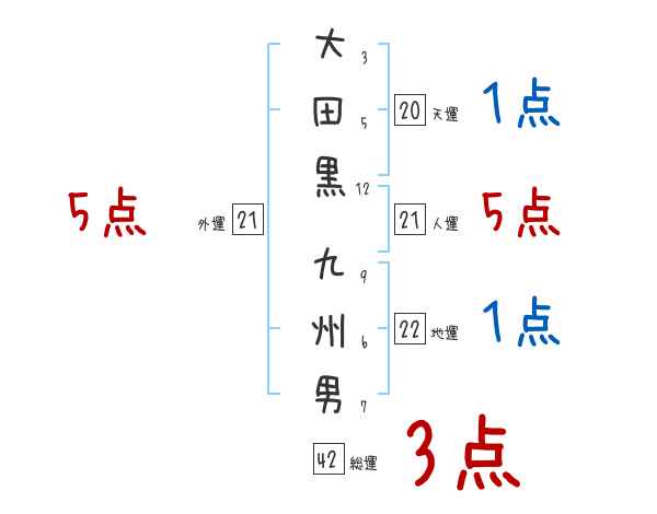 外運![]() | 大田黒九州男さんの外運は21画の5つ星!統率力がある。独立し成功する。名誉を手に入れる。 生活面を象徴する運勢です。外部から受ける影響力を表し、結婚運、家庭運や職場、環境への順応性を表します。 |
