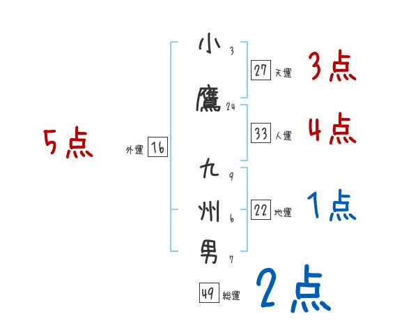 天運![]() | 小鷹九州男さんの天運は27画の3つ星!頭脳明晰だが強情で摩擦が多い傾向。孤立に注意。 家系が持つ宿命的な運勢を表します。祖先から受け継いだ苗字ですので自分の力が及びません。家柄を象徴します。 |