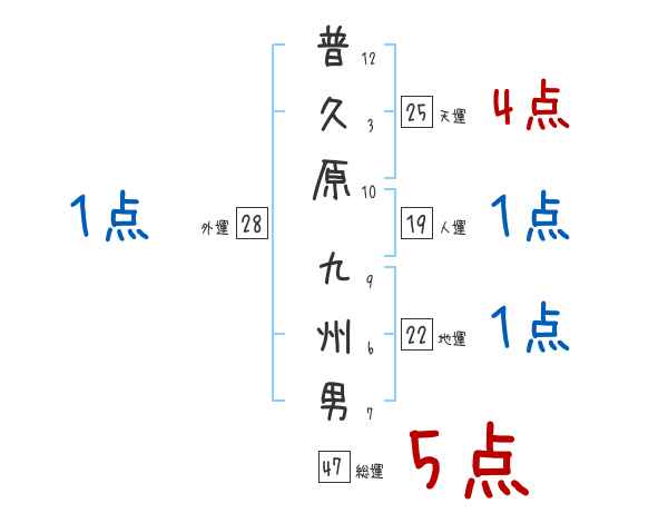 外運![]() | 普久原九州男さんの外運は28画の1つ星!家庭環境に注意。スポーツで活躍できる能力があるかも。 生活面を象徴する運勢です。外部から受ける影響力を表し、結婚運、家庭運や職場、環境への順応性を表します。 |