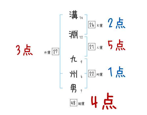 天運![]() | 溝淵九州男さんの天運は26画の2つ星!波瀾万丈かも。信頼できる人を大事にしましょう。 家系が持つ宿命的な運勢を表します。祖先から受け継いだ苗字ですので自分の力が及びません。家柄を象徴します。 |
