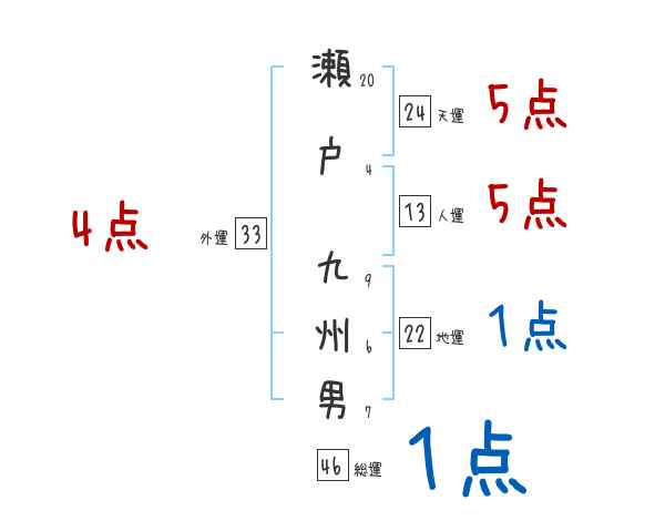天運![]() | 瀬戸九州男さんの天運は24画の5つ星!家庭運が良く順調な人生。金運にも恵まれる。 家系が持つ宿命的な運勢を表します。祖先から受け継いだ苗字ですので自分の力が及びません。家柄を象徴します。 |