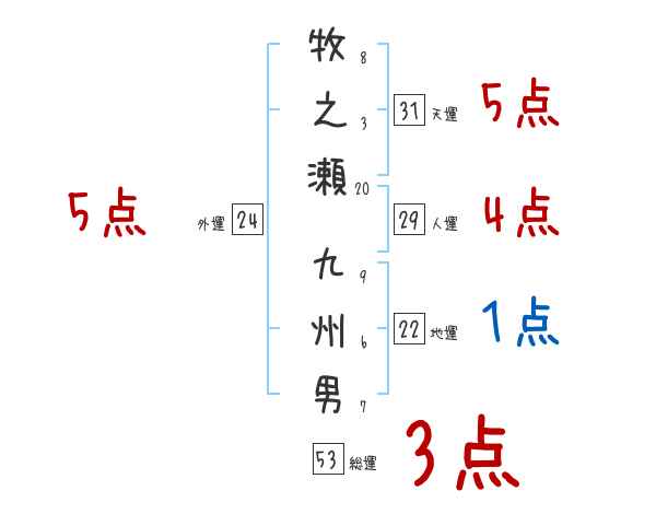 外運![]() | 牧之瀬九州男さんの外運は24画の5つ星!家庭運が良く順調な人生。金運にも恵まれる。 生活面を象徴する運勢です。外部から受ける影響力を表し、結婚運、家庭運や職場、環境への順応性を表します。 |