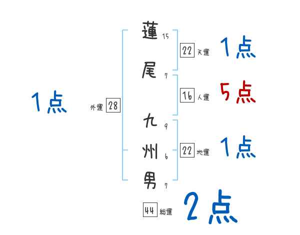 人運![]() | 蓮尾九州男さんの人運は16画の5つ星!人望が厚く大きく発展する。逆転成功が見える。 性格や才能などを表す2番目に重要な運勢です。人間関係や協調性、社会的な成功に影響します。主に20歳から50歳ぐらいまでの中年期の運勢を表します。 |