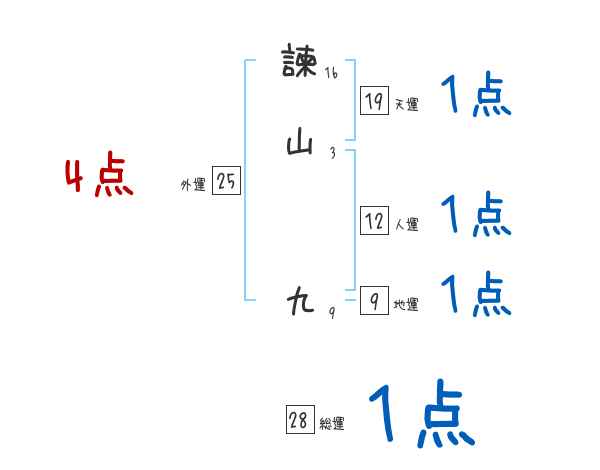 天運![]() | 諫山九さんの天運は19画の1つ星!優れた才能を持ちますが、協調性が足りないことも。周りの人と協力する事を意識しましょう。 家系が持つ宿命的な運勢を表します。祖先から受け継いだ苗字ですので自分の力が及びません。家柄を象徴します。 |