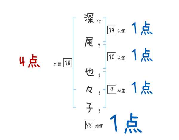 外運![]() | 深尾也々子さんの外運は18画の4つ星!情熱的で剛気。忍耐力があり信頼される。 生活面を象徴する運勢です。外部から受ける影響力を表し、結婚運、家庭運や職場、環境への順応性を表します。 |