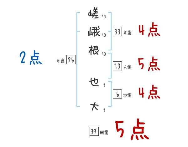 人運![]() | 嵯峨根也大さんの人運は13画の5つ星!才能に恵まれ人気がある。名声を手に入れる。円満な人生。 性格や才能などを表す2番目に重要な運勢です。人間関係や協調性、社会的な成功に影響します。主に20歳から50歳ぐらいまでの中年期の運勢を表します。 |