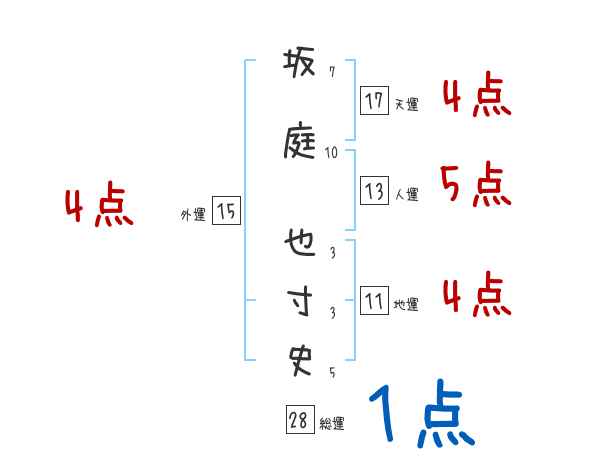 総運![]() | 坂庭也寸史さんの総運は28画の1つ星!家庭環境に注意。スポーツで活躍できる能力があるかも。 あなたの人生を表す1番重要な運勢です。生涯を通じて影響する総合運となり、主に50歳以降の晩年期に影響を及ぼします。 |