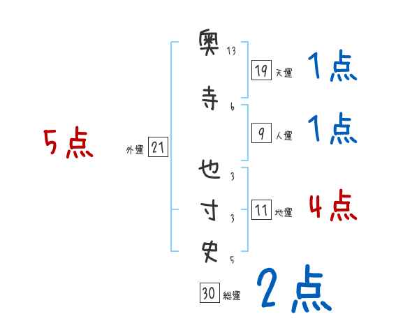 外運![]() | 奥寺也寸史さんの外運は21画の5つ星!統率力がある。独立し成功する。名誉を手に入れる。 生活面を象徴する運勢です。外部から受ける影響力を表し、結婚運、家庭運や職場、環境への順応性を表します。 |