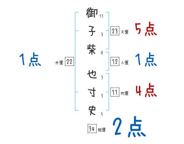 天運![]() | 御子柴也寸史さんの天運は23画の5つ星!想像力に優れ活力がある。一代で成功し名誉を手に入れる。 家系が持つ宿命的な運勢を表します。祖先から受け継いだ苗字ですので自分の力が及びません。家柄を象徴します。 |