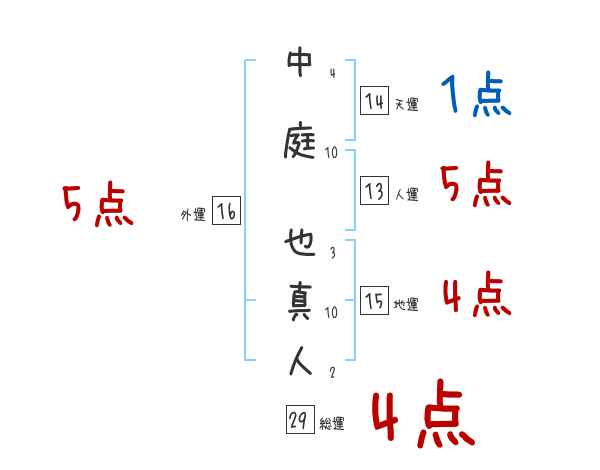 中庭也真人さんの画数の鑑定結果