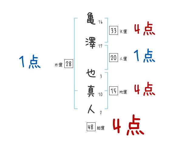外運![]() | 亀澤也真人さんの外運は28画の1つ星!家庭環境に注意。スポーツで活躍できる能力があるかも。 生活面を象徴する運勢です。外部から受ける影響力を表し、結婚運、家庭運や職場、環境への順応性を表します。 |