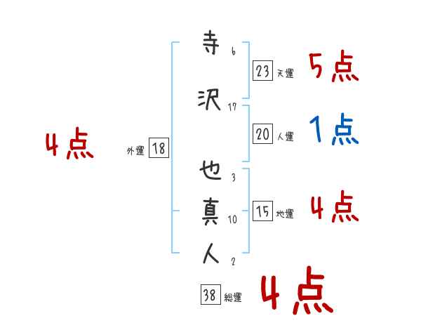 外運![]() | 寺沢也真人さんの外運は18画の4つ星!情熱的で剛気。忍耐力があり信頼される。 生活面を象徴する運勢です。外部から受ける影響力を表し、結婚運、家庭運や職場、環境への順応性を表します。 |