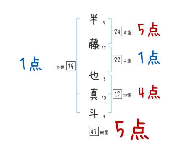 外運![]() | 半藤也真斗さんの外運は19画の1つ星!優れた才能を持ちますが、協調性が足りないことも。周りの人と協力する事を意識しましょう。 生活面を象徴する運勢です。外部から受ける影響力を表し、結婚運、家庭運や職場、環境への順応性を表します。 |
