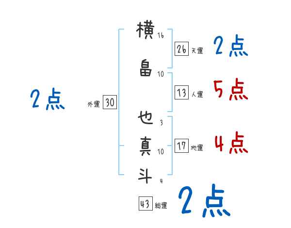 総運![]() | 横畠也真斗さんの総運は43画の2つ星!頑固な性格で独立心が強いかも。やや非現実的で浪費に注意しましょう。 あなたの人生を表す1番重要な運勢です。生涯を通じて影響する総合運となり、主に50歳以降の晩年期に影響を及ぼします。 |