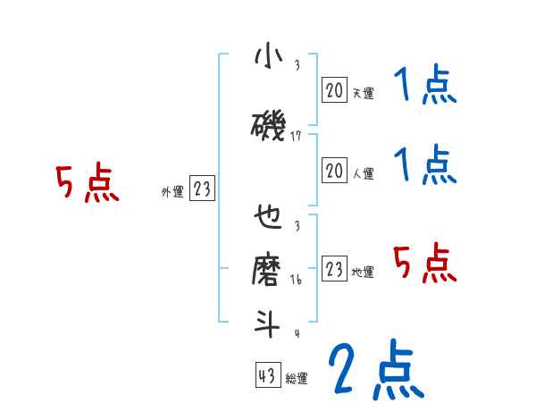 外運![]() | 小磯也磨斗さんの外運は23画の5つ星!想像力に優れ活力がある。一代で成功し名誉を手に入れる。 生活面を象徴する運勢です。外部から受ける影響力を表し、結婚運、家庭運や職場、環境への順応性を表します。 |