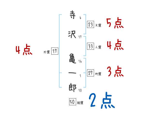 外運![]() | 寺沢亀一郎さんの外運は17画の4つ星!積極的な行動力。地位を気づき財産を手に入れる。純粋な心と直感力。 生活面を象徴する運勢です。外部から受ける影響力を表し、結婚運、家庭運や職場、環境への順応性を表します。 |