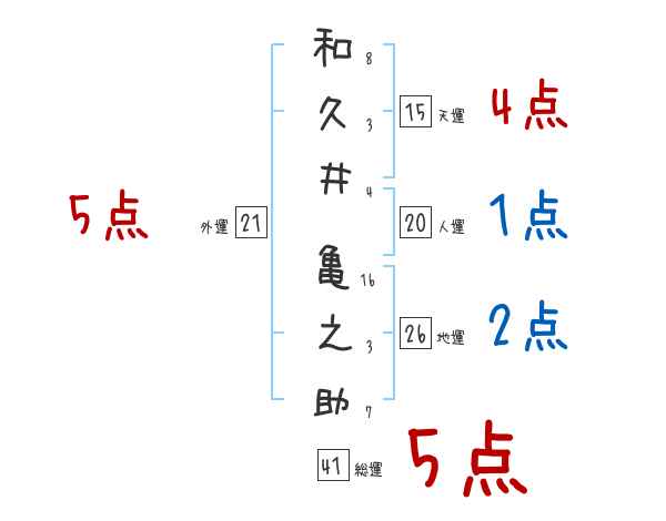 外運![]() | 和久井亀之助さんの外運は21画の5つ星!統率力がある。独立し成功する。名誉を手に入れる。 生活面を象徴する運勢です。外部から受ける影響力を表し、結婚運、家庭運や職場、環境への順応性を表します。 |