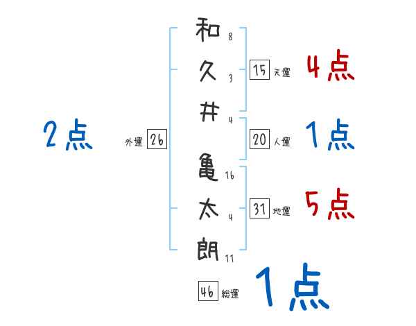 外運![]() | 和久井亀太朗さんの外運は26画の2つ星!波瀾万丈かも。信頼できる人を大事にしましょう。 生活面を象徴する運勢です。外部から受ける影響力を表し、結婚運、家庭運や職場、環境への順応性を表します。 |