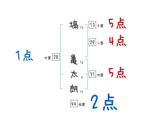 総運![]() | 塙亀太朗さんの総運は44画の2つ星!誠実で慎重な性格。物事を考えすぎないように注意しましょう。 あなたの人生を表す1番重要な運勢です。生涯を通じて影響する総合運となり、主に50歳以降の晩年期に影響を及ぼします。 |