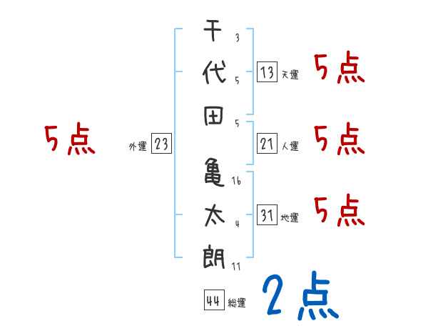 地運![]() | 千代田亀太朗さんの地運は31画の5つ星!社交性があり判断力に優れる。順風満帆な人生で円満な生活。 個性を表す基礎的な運勢です。性格形成や対人関係、行動力など家庭環境に影響されます。主に誕生してから20歳くらいまでの若年期の運勢を表します。 |